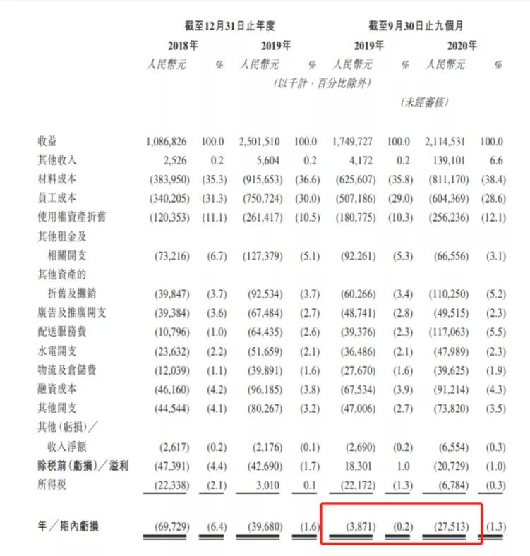 营收高速增长,但其盈利能力却是另一番景象:2018年的净亏损为6972.9万元,2019年有所收窄至3968万元;2020年前三季度的净亏损达到了2751.3万元,这一数据同比2019年同期387.1万元的净亏损,扩大了610.7%。