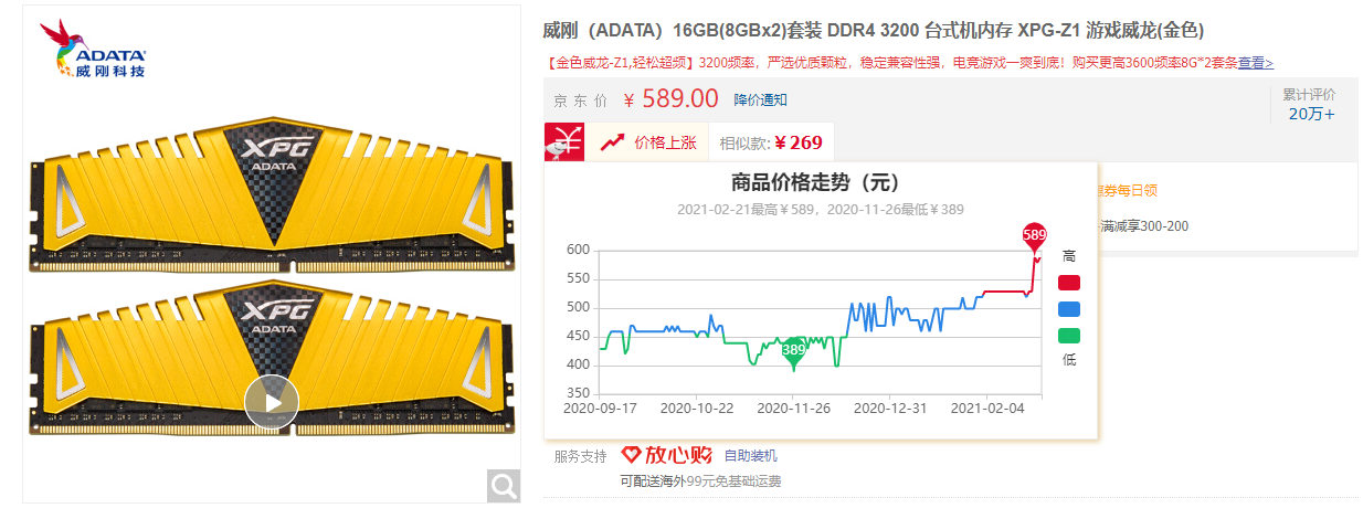 在芯片、颗粒厂商纷纷涨价的情况下,目前国内电商平台的内存都处于什么价位呢?小雷实际调查了一下,普遍采用三星、海力士颗粒的威刚DDR4-3200 16GB内存组合,去年11月的价格是389元,截稿前已经涨到了589元,而且价格依然在稳步提升当中。