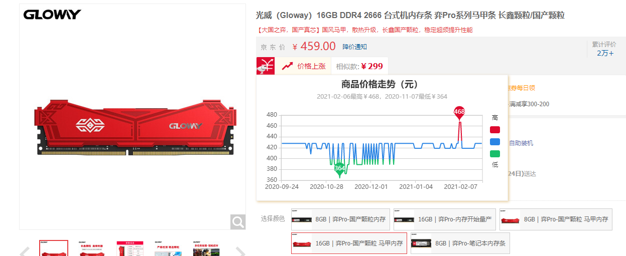 那么,目前采用国产颗粒的内存条又是什么情况呢?我们可以看到采用国产长鑫颗粒的光威 弈Pro DDR4-2666 16GB内存,去年10月份的价格是364元,截稿前已经涨到了459元。由此可见,无论采用国产颗粒还是进口颗粒,内存价格上涨这个情况正在普遍发生。