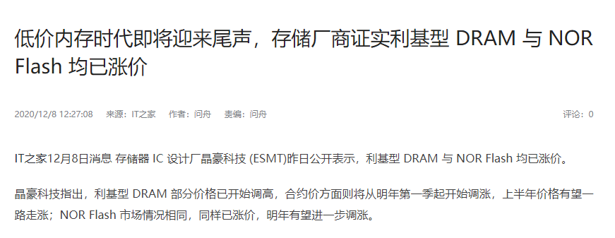 事实上,早在去年12月,行业内部就已经发出了内存即将涨价的信号。根据IT之家报道,存储器IC设计厂晶豪科技公开表示,利基型DRAM与NOR Flash均已涨价,合约价方面将从明年第一季起开始调涨,上半年价格有望一路走涨。供求关系紧俏带动IC涨价潮,不光多家原材料厂商已发调价函,三星、海力士和镁光等存储芯片大厂同样在提高着出货价格。