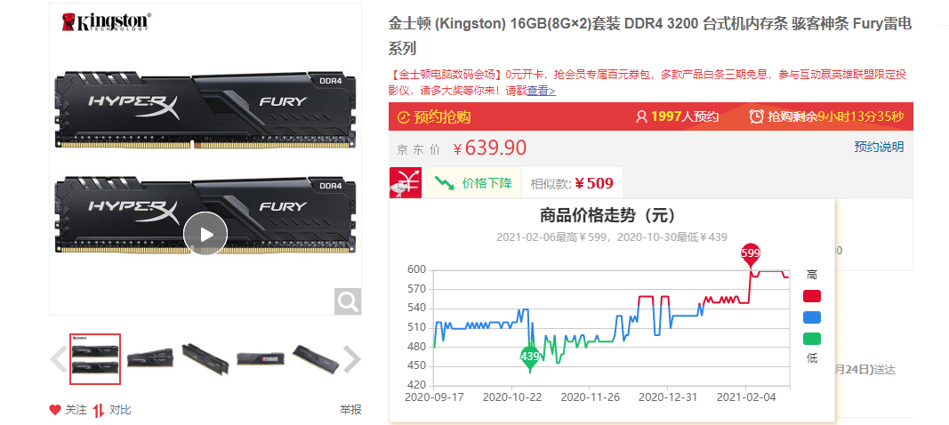 大家比较熟悉的金士顿 骇客神条DDR4-3200 16GB内存组合,去年10月份的价格是439元,截稿前已经涨到了639元。不仅如此,该产品目前仍然处于无货预购状态,内存供不应求的情况已经开始出现了。