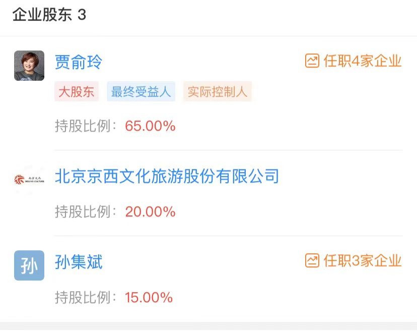 今时今日,栗坤更多被提起的身份是“耐飞科技创始人”,而大碗娱乐的股权架构也发生了变化:当前大碗娱乐的第一大股东为贾玲,持股65%,北京文化持股20%,孙集斌持股15%。其法定代表人为贾玲父亲贾文田。