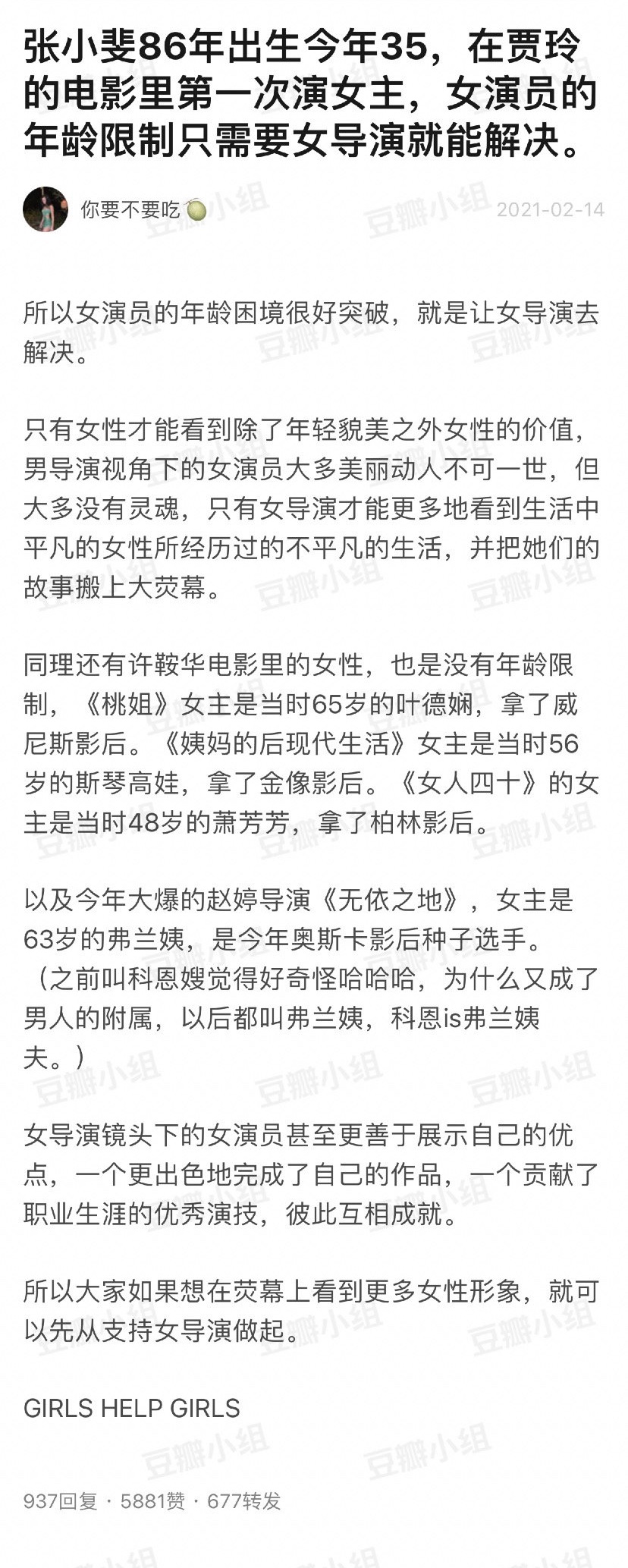 “《桃姐》女主是65岁的叶德娴,拿了威尼斯影后。《姨妈的后现代生活》是56岁的斯琴高娃,拿了金像影后……今年大爆的赵婷导演《无依之地》,女主是63岁的弗兰姨,是今年奥斯卡影后种子选手。女导演镜头下的女演员甚至更善于展示自己的优点,一个更出色地完成了自己的作品,一个贡献了职业生涯的优秀演技,彼此相互成就。大家如果想在银幕上看到更多女性形象,就可以先从支持女导演做起。”
