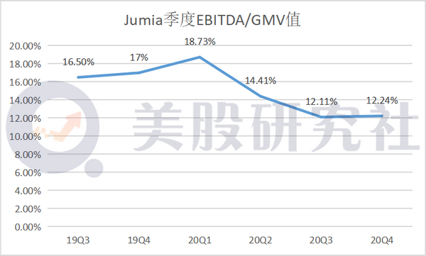 EBITDA比净利润更能反映公司真实的运营状况,从EBITDA/GMV的值来看,20年Q4这个值为12.24%,比去年Q4的17%下降了5.24%,可以看出Jumia的运营能力正在转好。