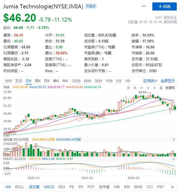 近日,Jumia公布了2020财年第四季度财报。财报显示,Q4营收4176万欧元,同比下降15.21%,GMV为2.31亿欧元,同比下降21%,净亏损4708万欧元,同比收窄。虽说第四季度营收超过预期,且EBITDA亏损收窄,但Jumia股价却在下跌。截至目前,Jumia股价为46.20美元,市值为37.53亿美元。