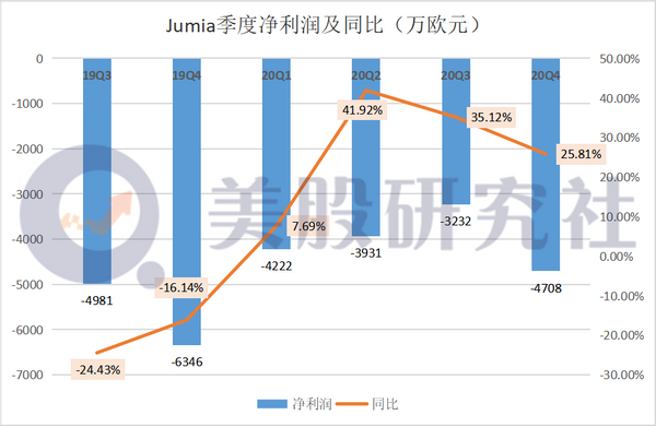 基于本季度促销力度减小,成本总支出的控制得当,Jumia在本季度实现了净亏损的收窄。据财报显示,Q4净亏损4708万欧元,同比下降25.81%。