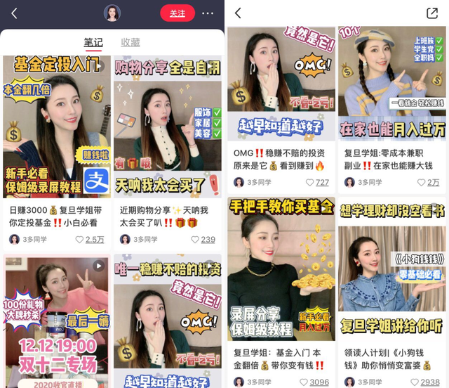 另一个名为“3多同学”的博主,小红书粉丝有21.4万,简介中自称是东方卫视记者,更新内容有脱毛仪测评、直播带货预告、撩汉大法等,同样并未展示自己有从事基金投资建议的资质,却在笔记中更新“复旦学姐教你卖出基金”、“日赚3000,复旦学姐带你定投基金”、“手把手教你买基金”等和基金操作相关的视频。
