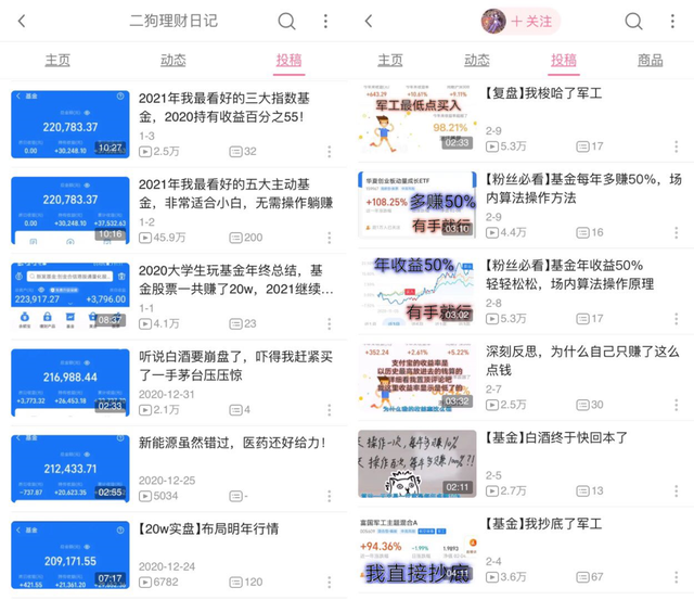 而这些UP主上传的内容不仅仅局限于分享自己买基金的经历、晒自己的投资收益、基金复盘等,有的会直接发布类似“粉丝必看:基金每年多赚50%的操作方法”的标题,带粉丝操作,或是在视频封面上用花字标注“年收益50%,有手就行”,承诺收益,或者直接推荐基金。UP主“二狗理财日记”就有一条名为“2021年我最看好的五大主动基金,非常适合小白,无需操作躺赚”的视频,播放量达45.9万。