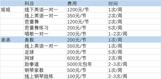 姐姐非常喜欢跳芭蕾,一周有2次1200元/小时的课程,还有5次200元/小时的练习课程,有时候参加比赛需要连续多天特训,单次也是1200元,她在芭蕾舞上一年的花费有16万左右。最近又报了一个一对一唱歌的寒假班,未来可能一周唱一到两次。上海好的老师都比较贵,当然也有便宜一点的课程和老师,我会帮她尽可能选最好的老师。