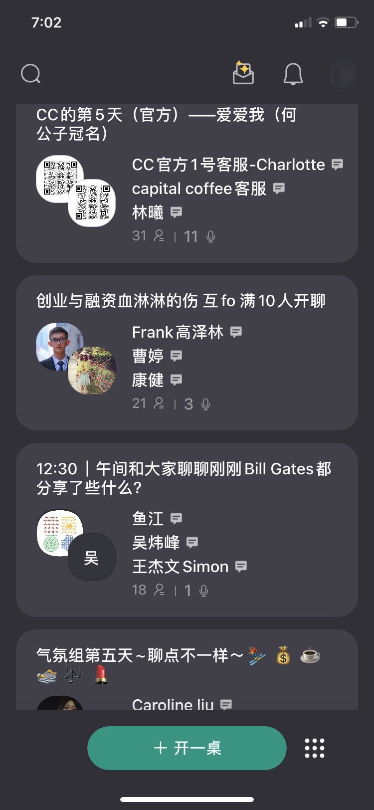 因此,诸如“聊聊国内版CH”的房间常常顶在首页,成为每个对话吧、Capital Coffee的用户必打卡的房间(当然也是因为目前可选择房间本身非常有限)。