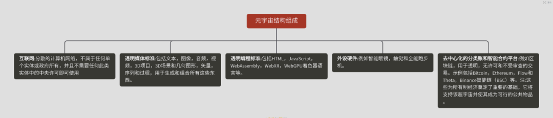 在文中,他对元宇宙的结构组成进行了一次粗略划分。Eric认为,元宇宙应由“互联网”、“透明媒体标准”、“透明编程标准”、“外设硬件”以及“去中心化的分类账和智能合约平台”组成。