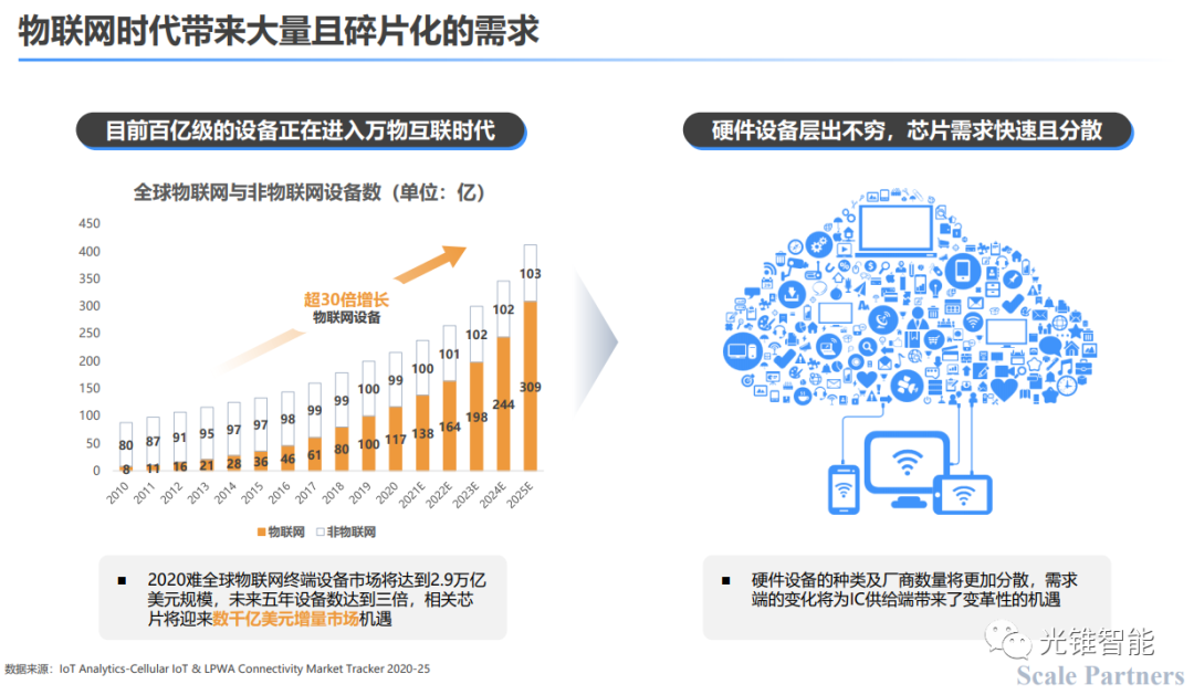 2019年全球物联网总连接数达到120亿,预计到2025年全球物联网总连接数将达到246亿,Semico预测,到2025 年,采用RISC-V架构的芯片数量将增至624亿颗,并进入包括计算机,消费者,通讯,运输和工业市场在内的细分市场。