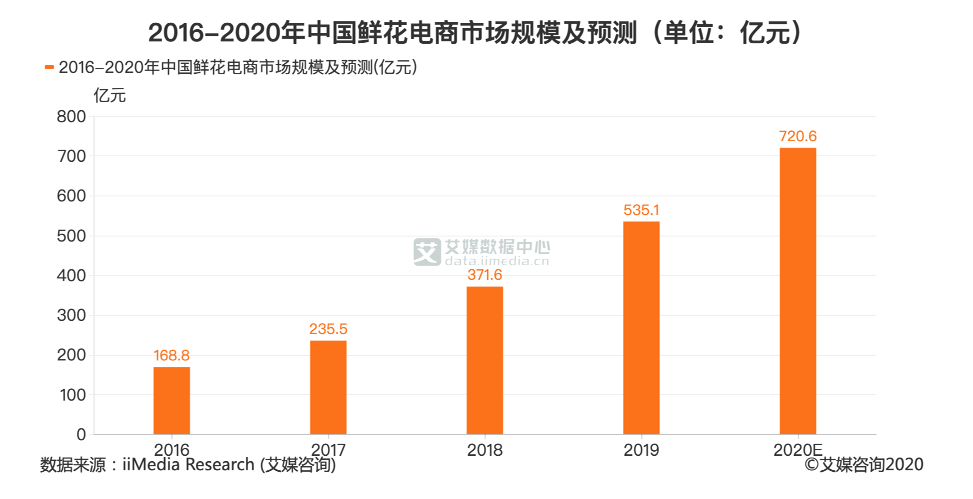 艾媒咨询数据显示,过去五年,国内鲜花电商市场迅速发展。按照预测,2020年鲜花电商市场规模达到720.6亿元,同比上年增长34.6%。