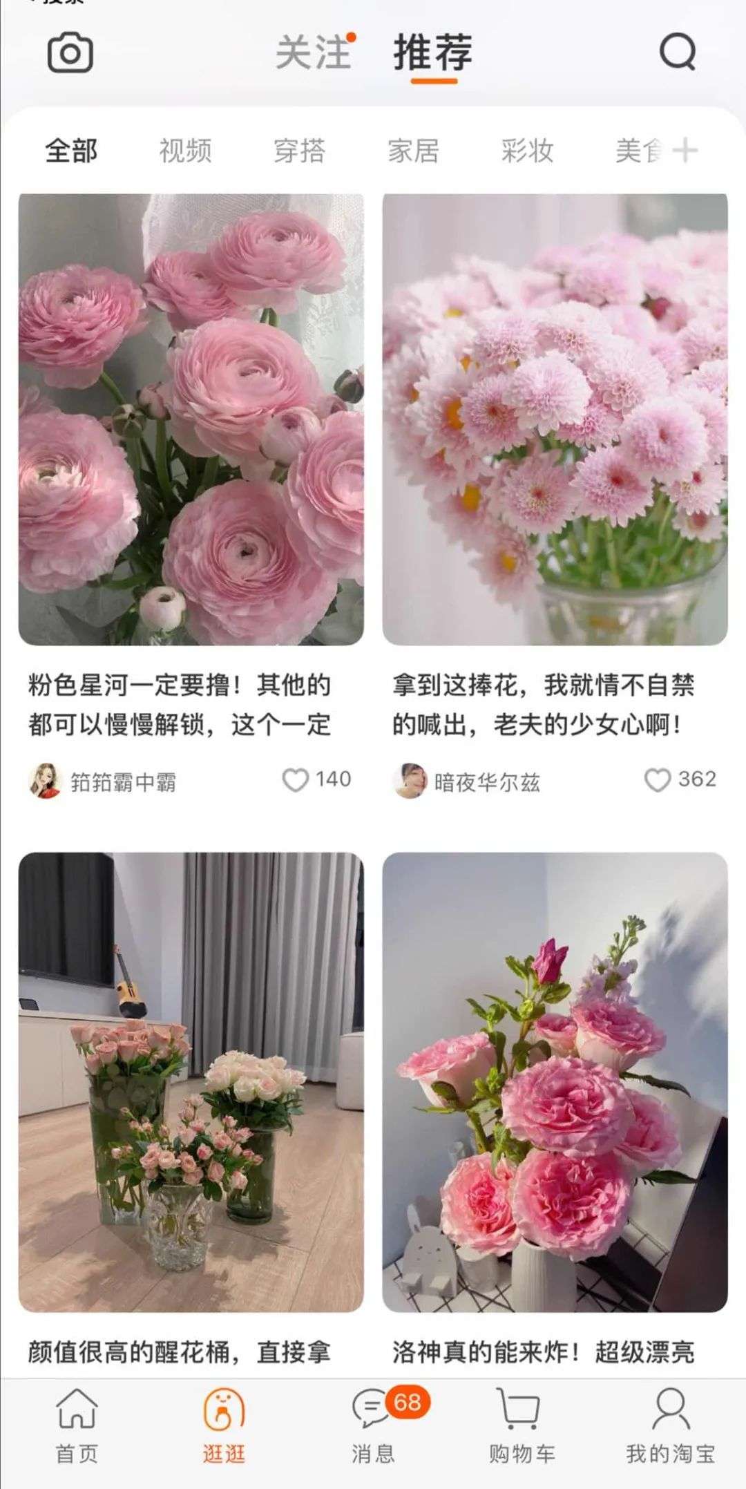 在淘宝新上线的内容主阵地“逛逛”,也有很多用户关联相关商品,分享自己的直播买花体验。
