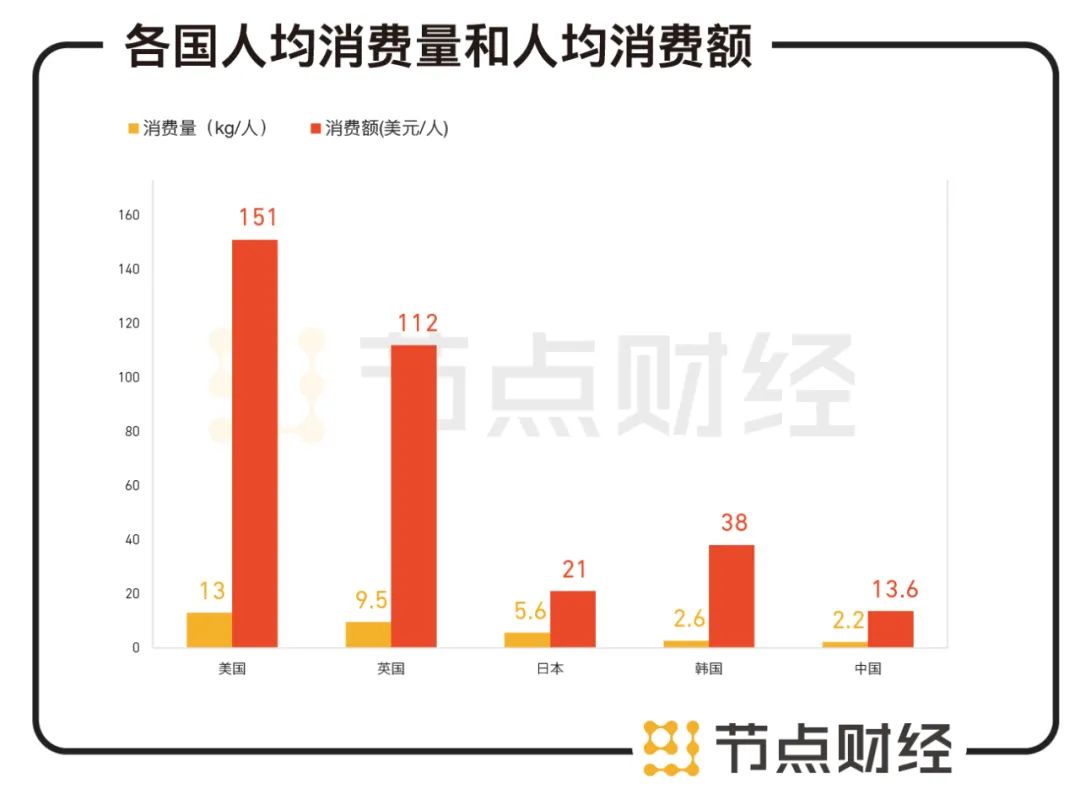 另外,从2019年的行业数据来看,美国、英国、日本、韩国等发达国家休闲食品人均消费量分别为13、9.5、5.6、2.6(kg/人),人均消费额分别为 151、112、91、38(美元/人),而我国目前休闲食品人均消费量和消费额分别为 2.2kg/人和 13.6美元/人,仍处于国际低位,未来仍有着广阔的提升空间。