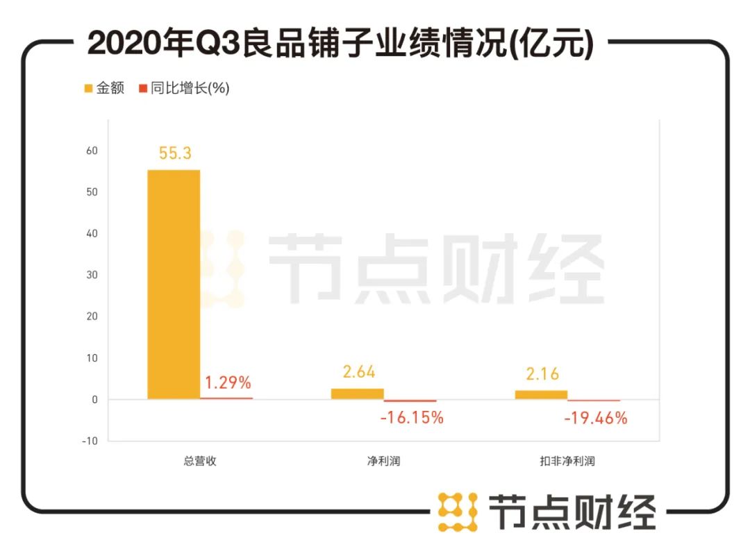据2020年三季报显示,当期良品铺子实现营收55.3亿元,同比增长1.29%;净利润2.64亿元,同比减少16.15%;扣非净利润2.16亿元,同比减少19.46%。