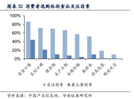 华安证券研报显示,消费者选购休闲食品最为关注的因素,排在前三的分别为口感、口碑和保质期,漂亮包装、明星代言位列末尾。