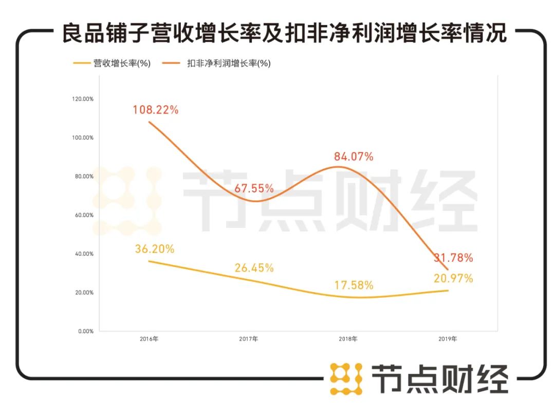 另外,2016年至2019年,良品铺子营收增长率分别为36.20%、26.45%、17.58%和20.97%,同期其扣非净利润增长率分别为108.22%、67.55%、84.07%和31.78%,业绩不俗。