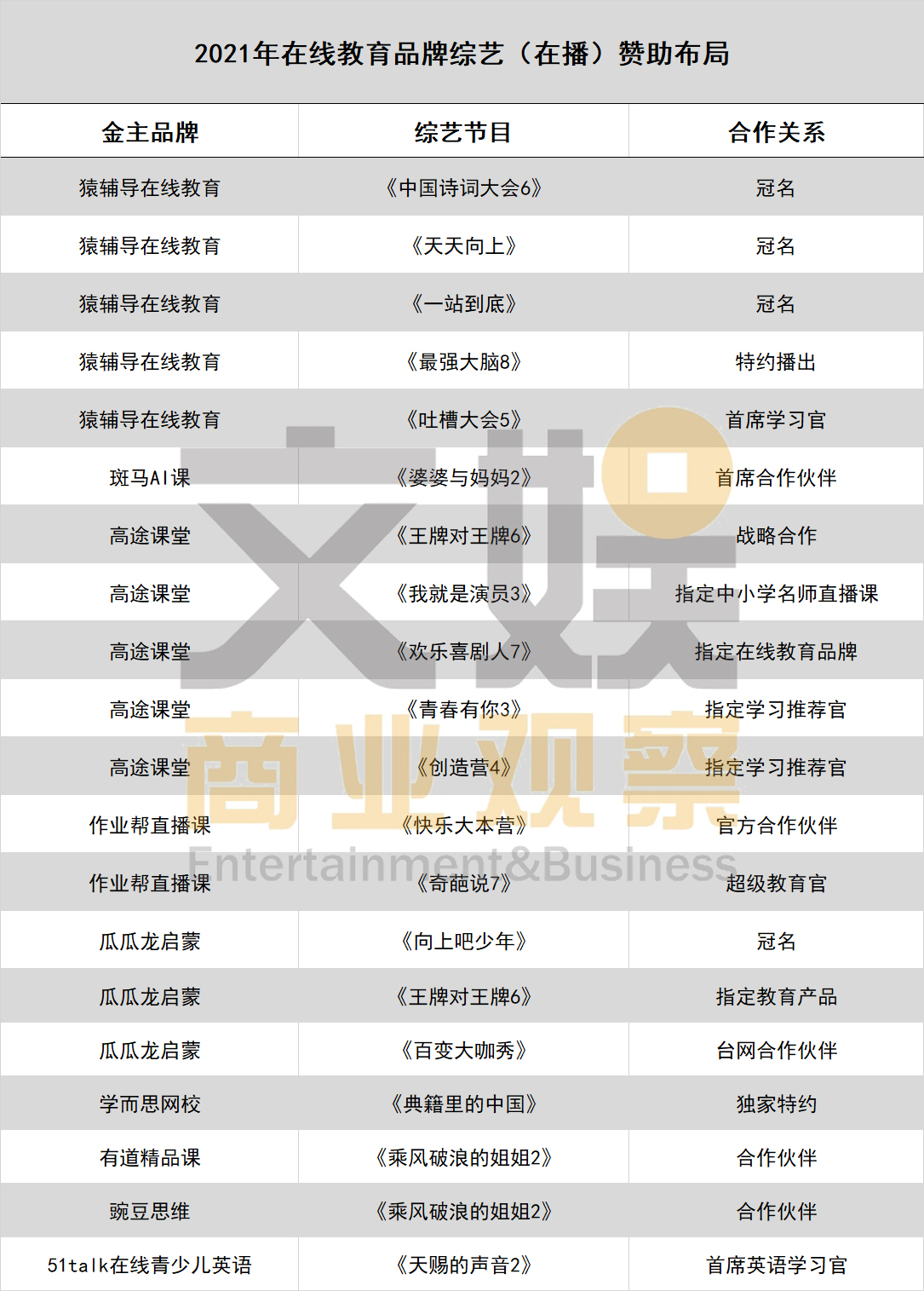 针对于近期频繁亮相综艺节目中的网课品牌,文娱商业观察整理了一份2021年在线教育品牌综艺赞助布局,所收录的当前在播综艺就有20档有着在线教育品牌的身影。