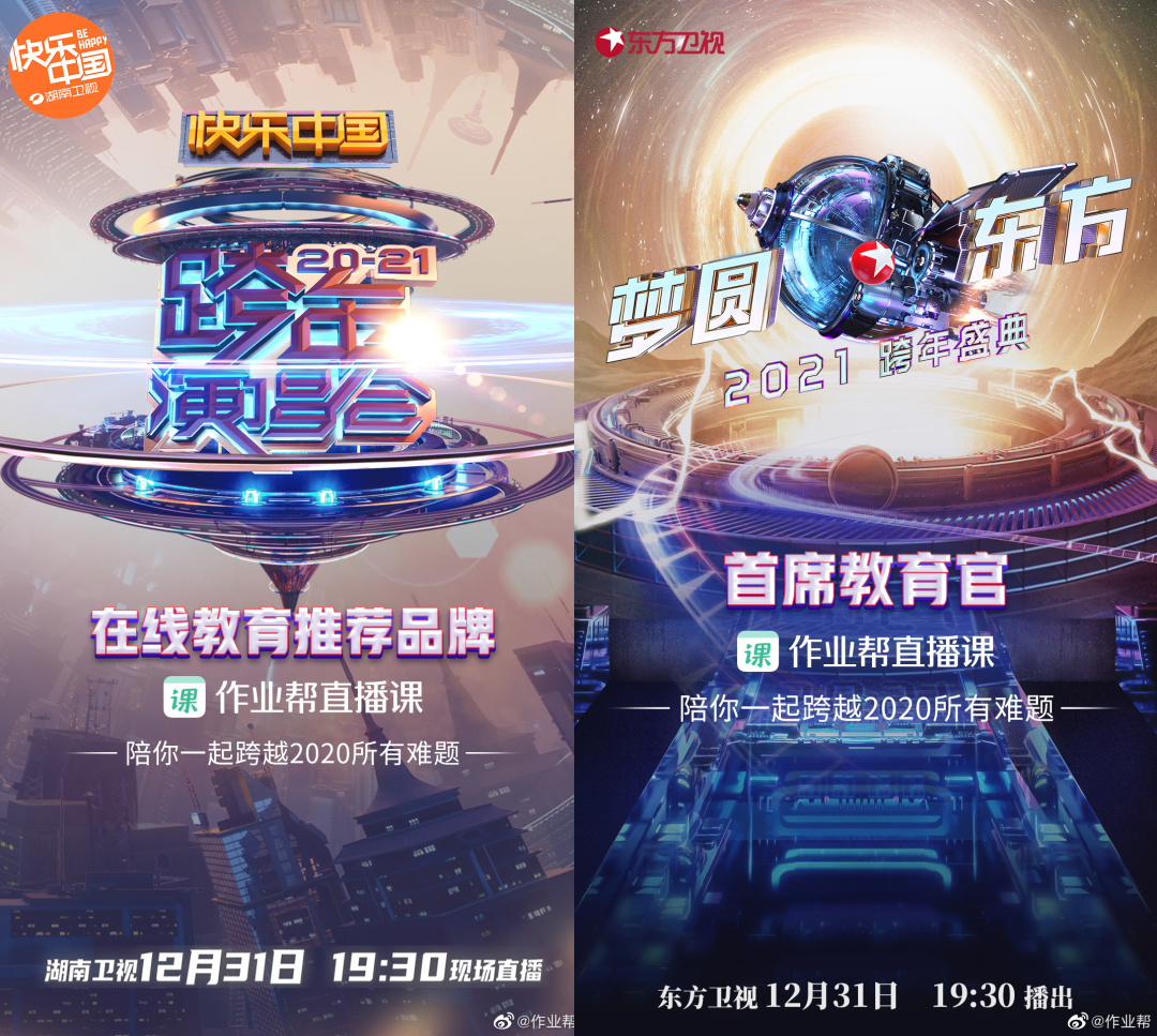 根据相关统计,在2020年,作业帮直播课共合作台网综艺节目21档,其中包含了15档综艺和6档晚会。年底,与湖南卫视和东方卫视两台跨年晚会进行合作,在近期播出的电视剧《赘婿》中,也进行了刷屏的洗脑广告输出。
