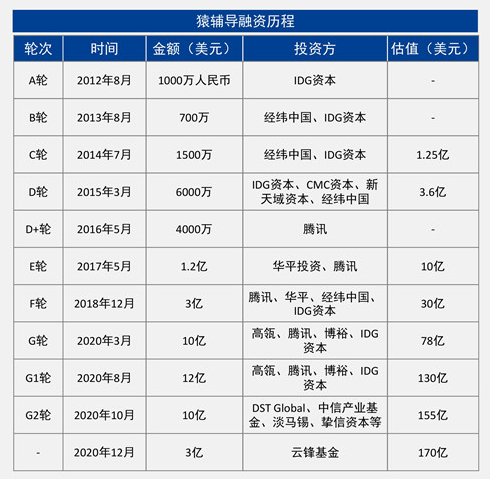 在综艺赞助上“壕”气十足的猿辅导,在2020年3月、8月、10月、12月分别完成了四轮数亿美金融资,2020年合计融资总额达35亿美金,约合人民币约227亿元。