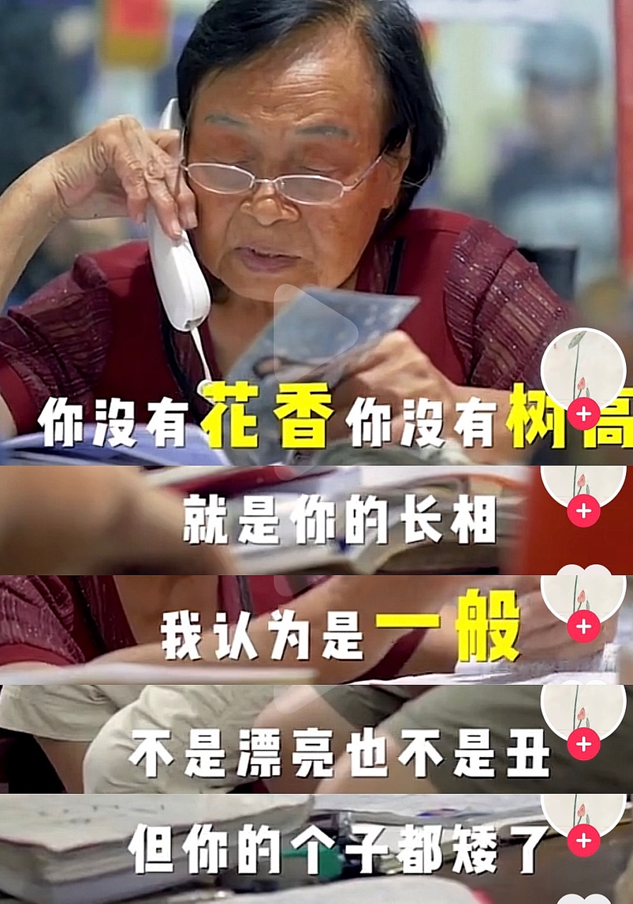 “你没有花香没有树高,就是你的长相, 我认为是一般,不是漂亮也不是丑,但你的个子都矮了。”面对自身外表条件一般,却对女孩长相苛求挑剔的男生,奶奶直截了当的让他直面现实。