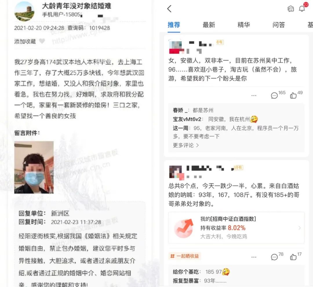 当代年轻人的婚恋状况实在堪忧,18-25的年轻人忙着学历内卷,考研考博考证,25+的男女忙着拼工作,996,大小周,考编考公考在职。越来越多的年轻人困于社交圈的固定、工作学习生活的忙碌,没有时间也没有途径交友,不知不觉就到了被家长催婚的年纪。甚至有武汉小伙在城市留言板上发帖求助,希望“国家能分配一个靠谱的对象”。
