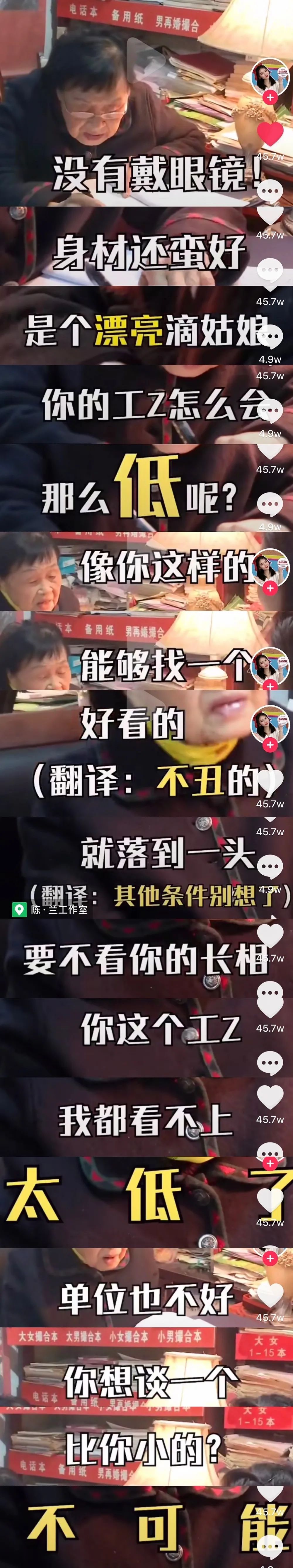 这个充斥着奶奶日常“毒舌rap”的地方叫陈兰工作室,是一家免费的婚恋工作室,坐落在武汉的一间小平房内,在这个让广大单身男女又期待又恐惧的小小一室一厅内,曾经凑成过2600多对佳偶,相当于解救了5200只单身狗。多少父母流下了喜悦的泪水。