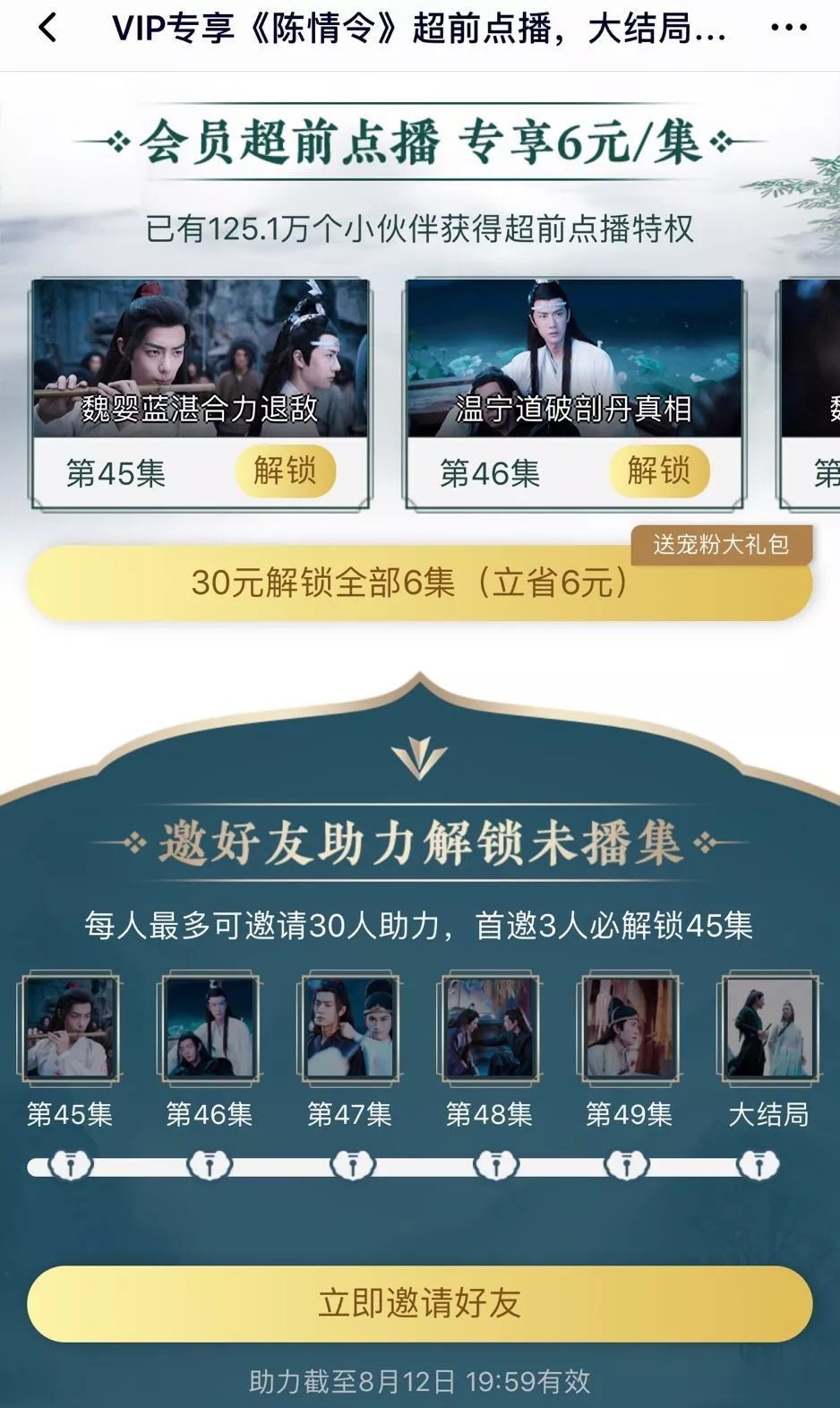 改变是从2019年那个夏天,DM剧《陈情剧》的一炮而红,也让剧集市场“售后”模式开启新篇章:30元提前解锁大结局、直播付费观看《陈情令》演唱会、售卖魏无羡等剧中人物服饰、衍生开发同名网络电影和手游……《陈情令》的IP衍生与售后,可谓是将剧集市场粉丝经济发挥至最大。据悉,那场超前点播中,仅24小时之内就收割7800多万,“博君一肖”CP演唱会门票最高价格一度被炒至上亿。