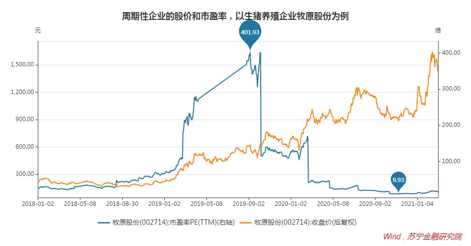 以生猪养殖企业牧原股份为例,2019年9月5日动态市盈率超过400倍,但此时的股价仍处于相对低位;之后,随着猪肉价格上涨催动企业利润大幅增长,市盈率却一路走低,一度跌至9.93倍的低点,但此时的股价已屡创新高。