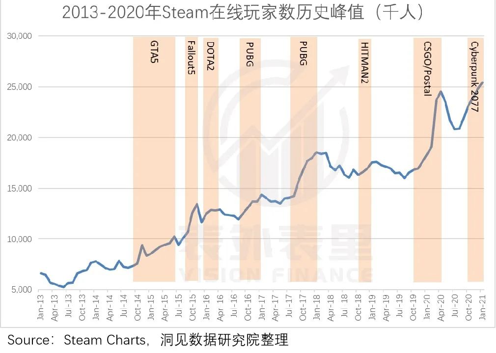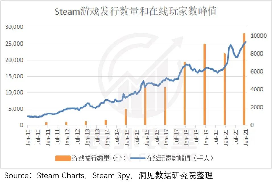 游戏开发者的大量涌入,促进了Steam内容生态的扩大。而随着游戏发行数量的增加,Steam在线玩家规模进一步凸显。