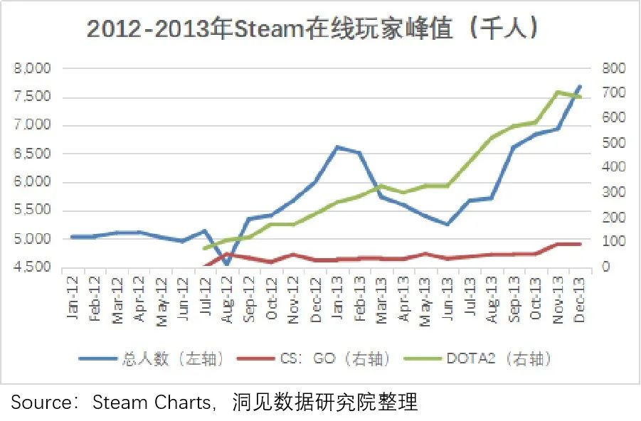 相比之下,Steam2013年正式自研发行的《DOTA2》,一上线就获取了极高的人气,实现游戏玩家和平台在线玩家的同向增长。