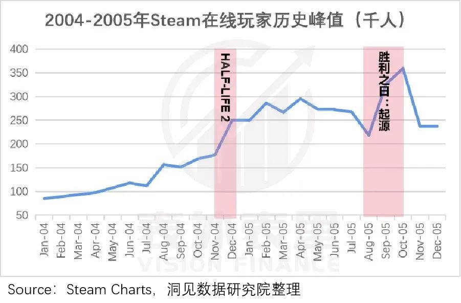 2005年,V社趁胜追击,紧随《半条命2》之后,发行另一款自研游戏《胜利之日:起源》(Day of Defeat: Source),再次打造在线玩家峰值。