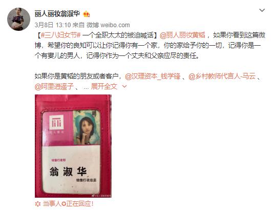就在3.8妇女节当天,微博用户“丽人丽妆翁淑华”发布长文,称自己的丈夫是丽人丽妆董事长黄韬,但其长期不归家,不得不在微博上喊话寻找自己的丈夫。同时,这条寻夫微博还@了阿里巴巴创始人马云、阿里巴巴董事会主席张勇、得到app创始人罗振宇、网红papi酱等人。