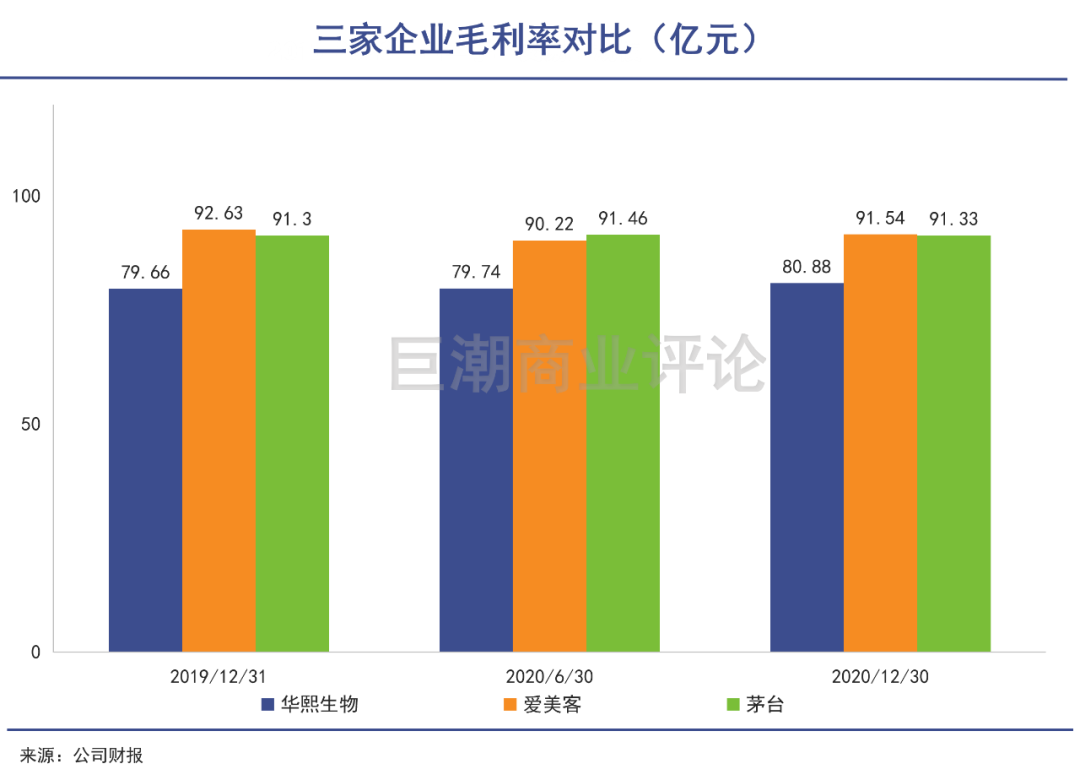 高昂的利润为公司带来了超高毛利率。翻阅2020年三季度财报发现,华熙生物毛利率超过80%,爱美客高达91.54%,甚至超越了茅台的91.33%。