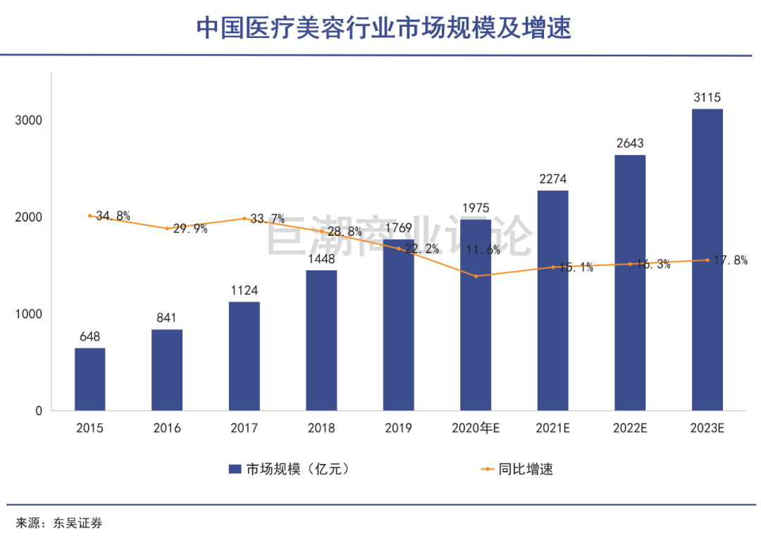 东吴证券也做出预测,2020年中国医疗美容市场规模约1975亿元,预计2023年市场规模达3115亿元。
