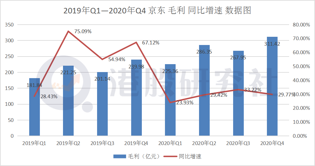 销售成本的增长也在一定程度上,影响到毛利增速。财报显示,2020年四季度,京东毛利为311.42亿元,同比增长29.77%。虽然毛利体量相比三季度有进一步提升,但在毛利增速上,四季度毛利增速略低于三季度毛利增速。