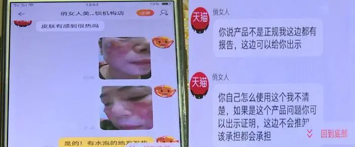 佛山南海区的郑女士去年10月网购的一款美容仪,使用时脸上起了水泡,治疗一个多月烫伤仍未恢复。郑女士多次跟商家沟通,对方发来一份2016年的产品检测报告证明产品合格,并让郑女士自己拿该产品去做检测。