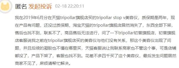 还有用户在投诉平台上表示,自己花费接近4000元买的tripollar stop v美容仪还在保质期内,因产品问题却找不到售后。原来该用户购买时的tripollar旗舰店找不到了,产品也已下降,新的tripollar初普旗舰店认为跟他们没有关系。