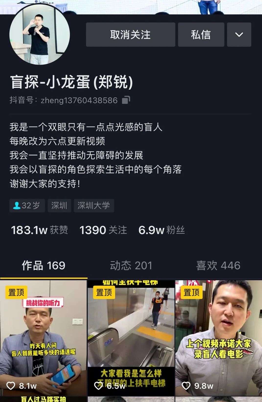 郑锐在抖音运营一个叫做“盲探-小龙蛋”的账号,这个名字,前半部分是是社会定义的他的身份:一个盲人。后半部分是郑锐的微信昵称,因为自己属龙,他叫自己小龙蛋。