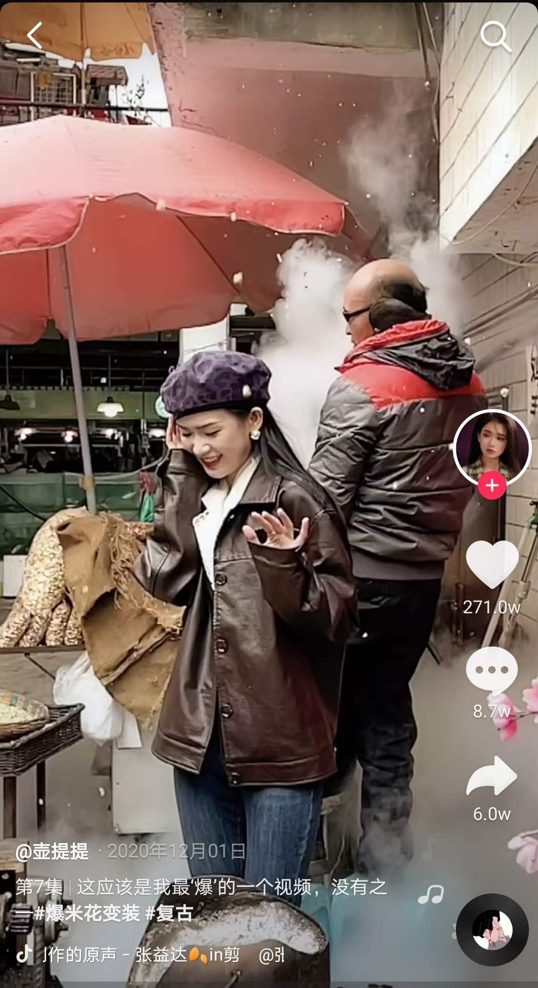 而最让她出圈的视频,还属那条爆米花变装。在菜市场门口,伴随着老式爆米花机“砰”的一声,壶提提变换了10余个造型,截至目前该条视频获赞271.0w,还在抖音掀起了爆米花变装风潮,截至目前该话题下的视频播放总量高达25.2亿次。