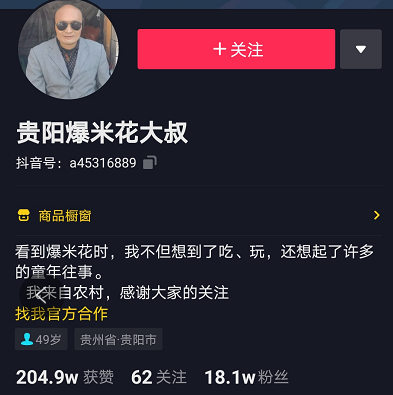 据说还带火了爆米花大叔,让他的生意变好,大叔还特意拍视频感谢。截至目前,爆米花大叔的抖音账号目前粉丝已有18.1w。