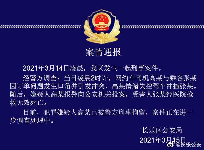 今日午间,长乐公安发布通报称,2021年3月14日凌晨,福建长乐区发生一起刑事案件。经调查:当日凌晨2时许,网约车司机高某与乘客张某因订单问题发生口角并引发冲突,高某情绪失控驾车冲撞张某。随后,嫌疑人高某报警向公安机关投案,受害人张某经抢救无效死亡。目前,犯罪嫌疑人高某已被警方刑事拘留,案件正在进一步调查处理中。