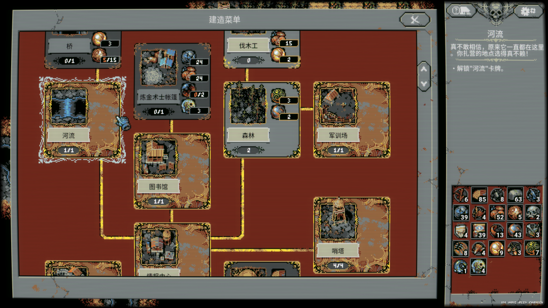 除了这些,游戏中建造玩法也相当重要,沙漠、河流等属性更强的资源牌就需要刷到一定资源才可以解锁,玩家也可以建造箭塔或者仓库,增加战斗中收益。