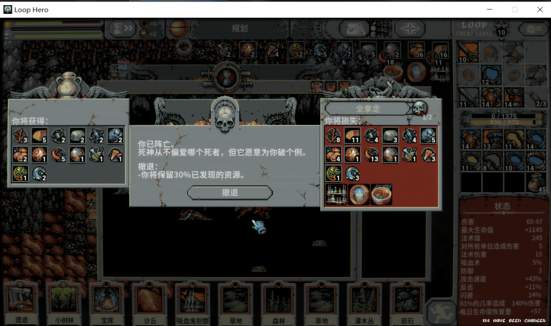 传统Roguelike游戏的死亡惩罚通常较重,一般是全部进度或者资源归零。LoopHero对死亡惩罚做了巧妙优化,玩家战斗中死亡也可以获得30%的资源,在一圈的中途阵亡可以获得60%的资源,回到营地撤退可以带走100%的资源。