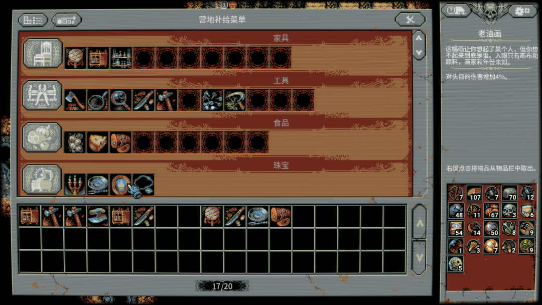 游戏中还有补给和打造菜单,后期战斗中掉落的家居、工具、食品、珠宝,都可以带回营地,装备后给玩家提供加成。掉落的物品也可以打造成资源。