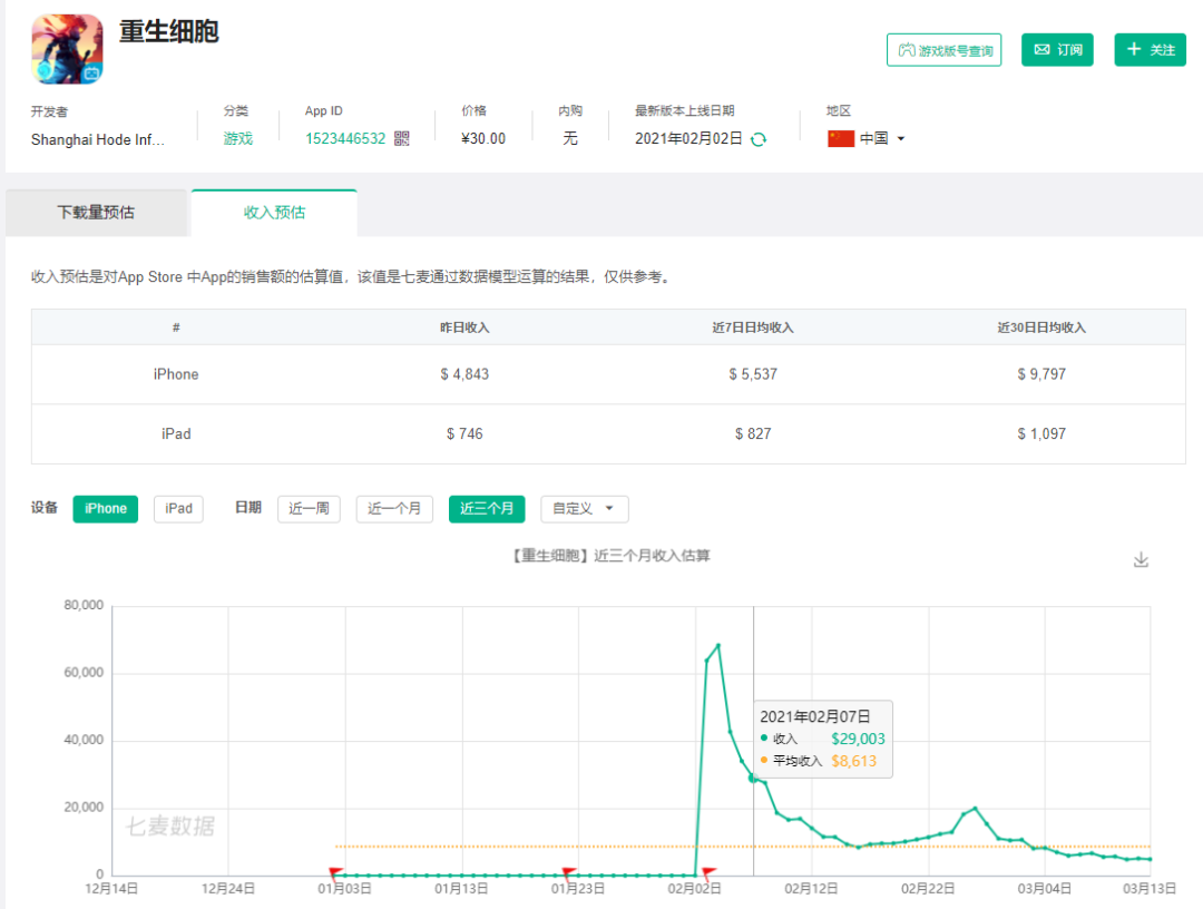 2020年12月《死亡细胞》全球销量350万份,让人看到Roguelike品类的潜力。七麦数据显示手游版移植版《重生细胞》iOS端收入最高单日突破6万美金,此后逐渐下滑,销量并不高。