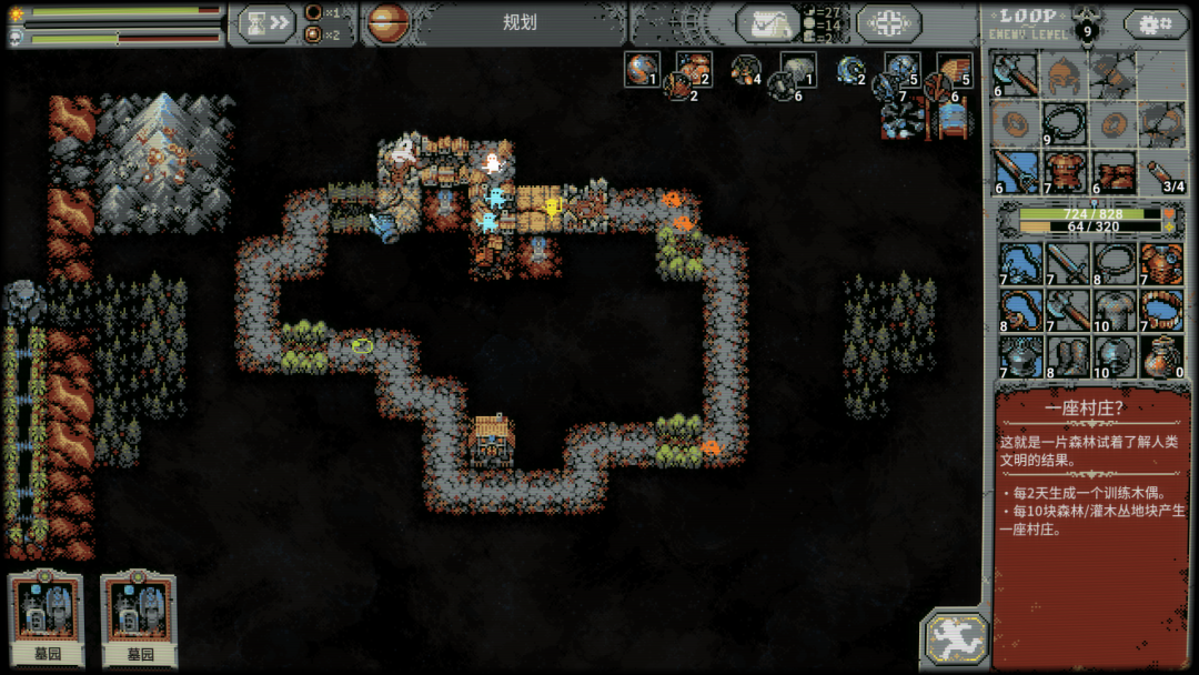 • 【村庄】是一张路过就回血的牌,看起来很实用。但放置两个【村庄】就会生成【山贼营地】,每两天生成的山贼有5%的几率销毁你的一件装备,玩到后期装备成型后被销毁,相当于挨上当头一棒。