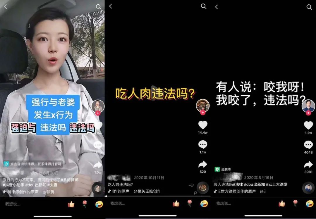 开菠萝财经发现,抖音快手上的律师做的普法视频形式主要分两种,一种是帅哥美女针对话题复述法条,主要比拼颜值;另一种是分析猎奇、低俗的话题,当然也有这两种的结合体。以“强迫与老婆同房违法吗”“吃人肉违法吗”“嫖娼不给钱违法吗””跟别人老婆同居违法吗”“有人说,咬我啊,我咬了违法吗”等为标题的案情讲解在快抖上随处可见,部分话题的脚本甚至也是大同小异。