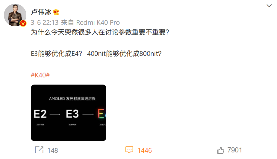 在距离iQOO 7发布前几(4)个小时,卢伟冰在微博放出了还要一个多月后才发布的K40系列的起售价,并强调是“性价比之王”,简而言之,K40将是搭载骁龙888最便宜的手机。